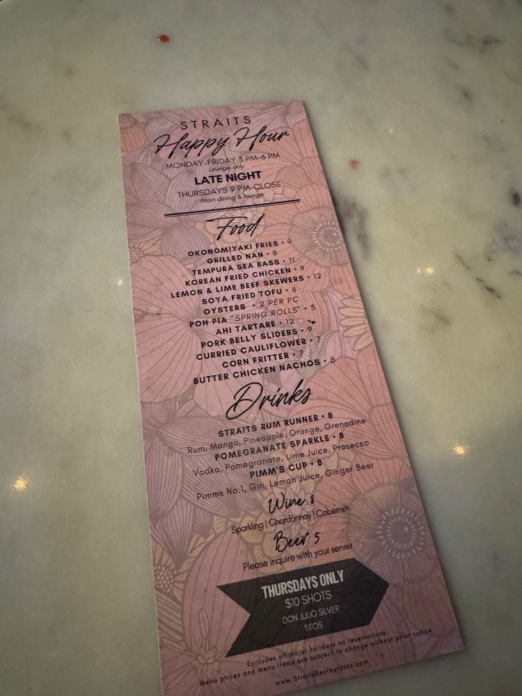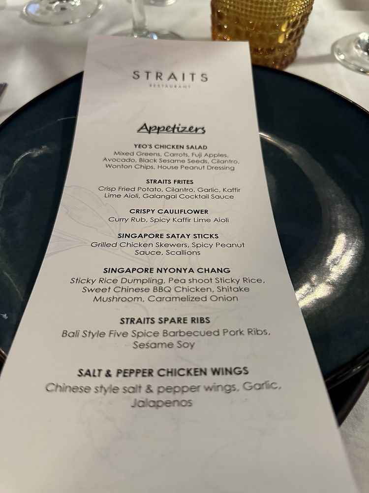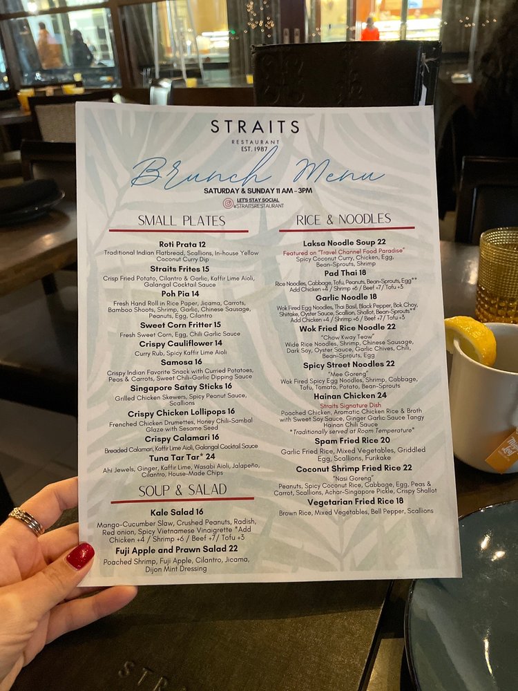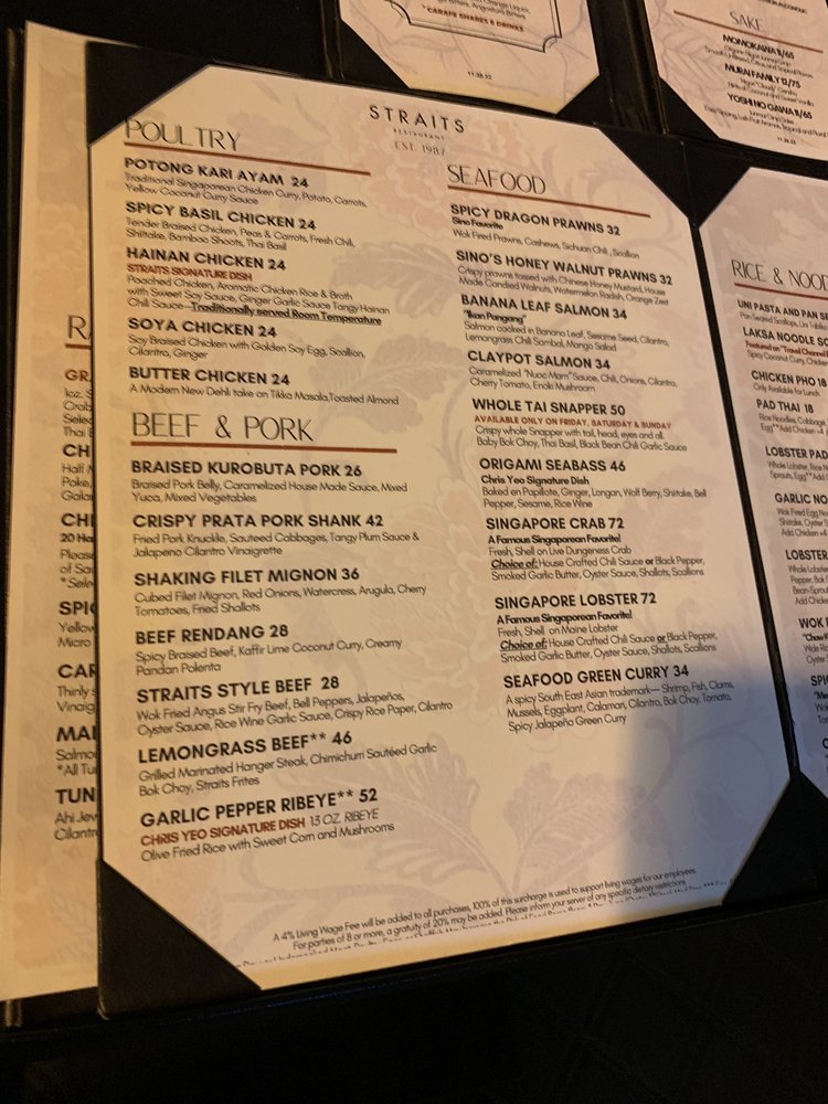 Introducing the menu at Straits - Santana Row, a trendy Asian-owned restaurant located at 333 Santana Row Ste 1100 San Jose, CA. With a wide range of options for pescatarians, vegans, and vegetarians, this restaurant offers a vibrant ambiance and attentive service. Customers rave about the flavorful dishes and accommodating staff, making it a great spot for dinner with friends or family. From delicious lobster garlic noodles to butter chicken and prime rib specials, there is something for everyone to enjoy. While prices can be on the higher side, the quality of the food and unique dining experience make it worth the visit. Whether you're looking for a lively place to enjoy drinks and appetizers or a cozy spot for a relaxed meal, Straits - Santana Row delivers on both taste and ambiance.