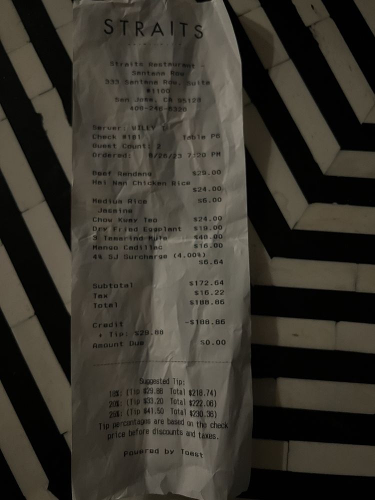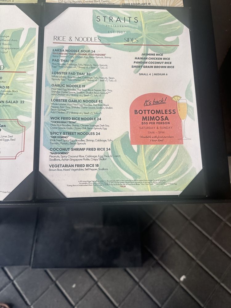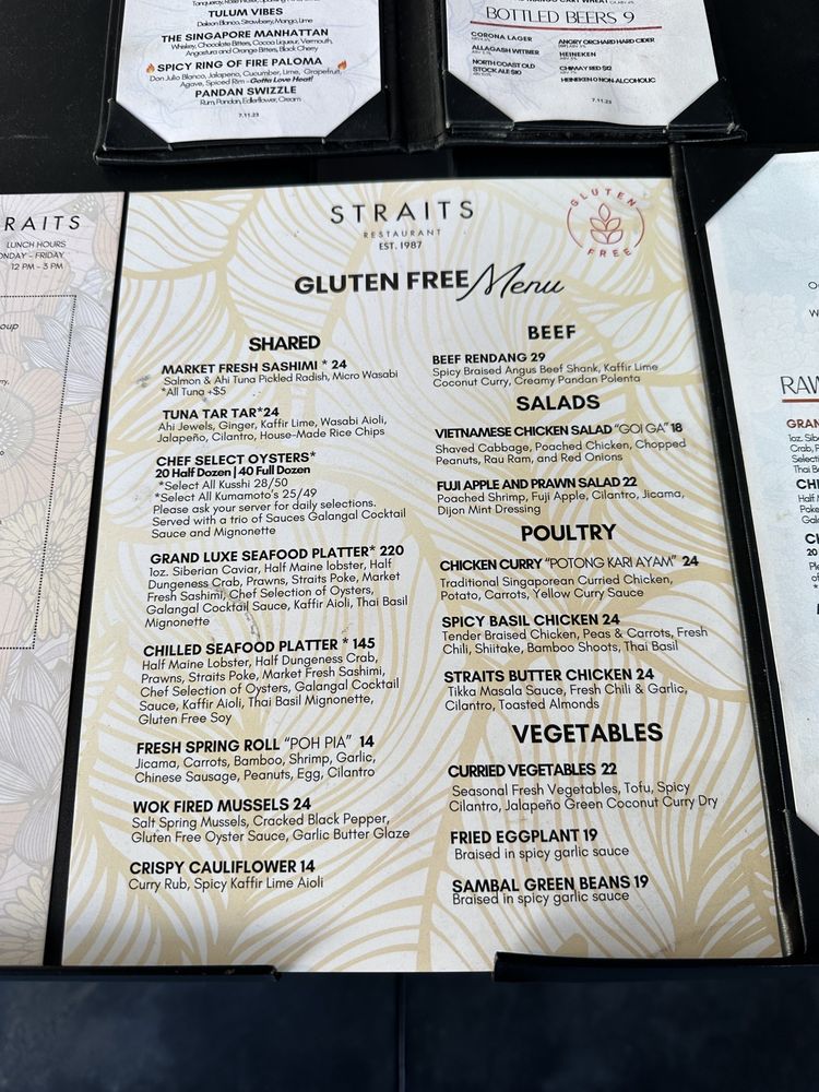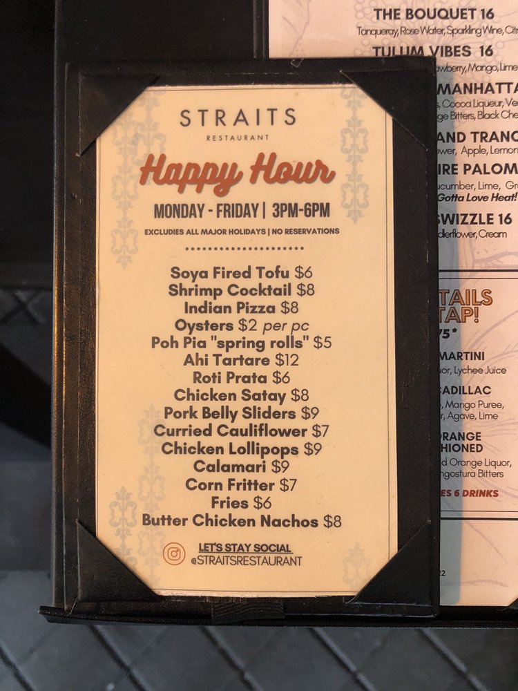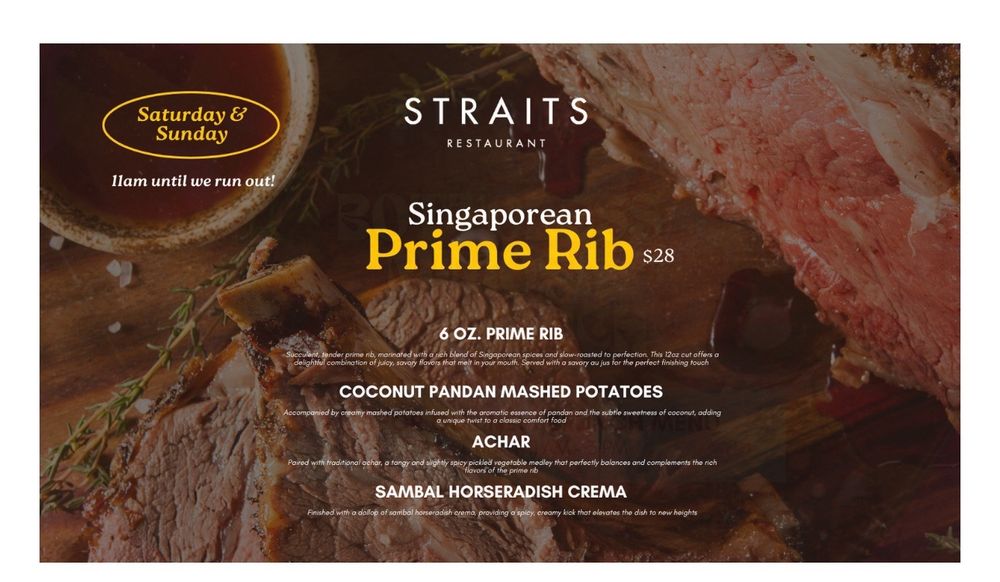 Introducing the menu at Straits - Santana Row, a trendy Asian-owned restaurant located at 333 Santana Row Ste 1100 San Jose, CA. With a wide range of options for pescatarians, vegans, and vegetarians, this restaurant offers a vibrant ambiance and attentive service. Customers rave about the flavorful dishes and accommodating staff, making it a great spot for dinner with friends or family. From delicious lobster garlic noodles to butter chicken and prime rib specials, there is something for everyone to enjoy. While prices can be on the higher side, the quality of the food and unique dining experience make it worth the visit. Whether you're looking for a lively place to enjoy drinks and appetizers or a cozy spot for a relaxed meal, Straits - Santana Row delivers on both taste and ambiance.